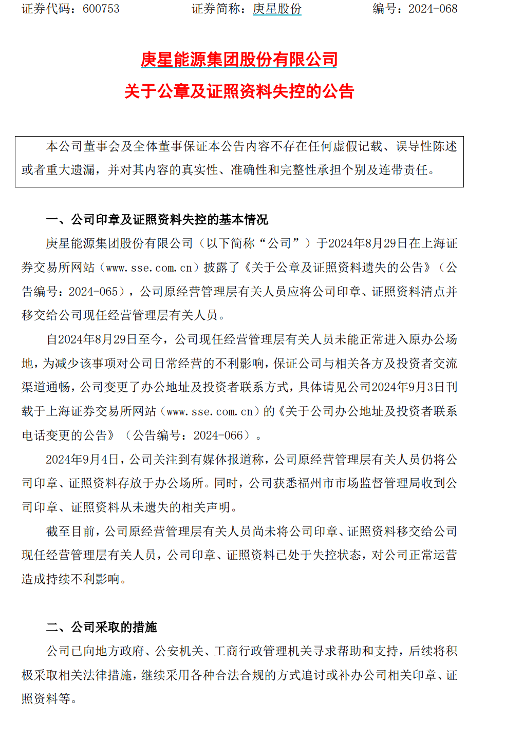 9月4日晚,上市公司庚星股份公告:公司钤记、证照贵寓已处于失控景况,对公司宽敞运营酿成抓续不利影响。