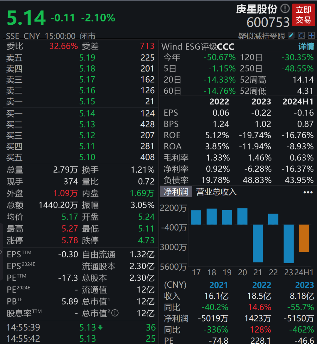 9月4日收盘,庚星股份跌2.1%。2024年以来,该公司股价已累计跌超50%。